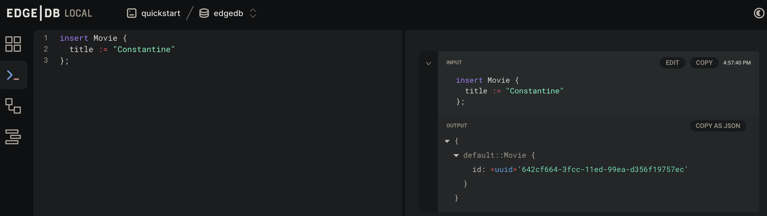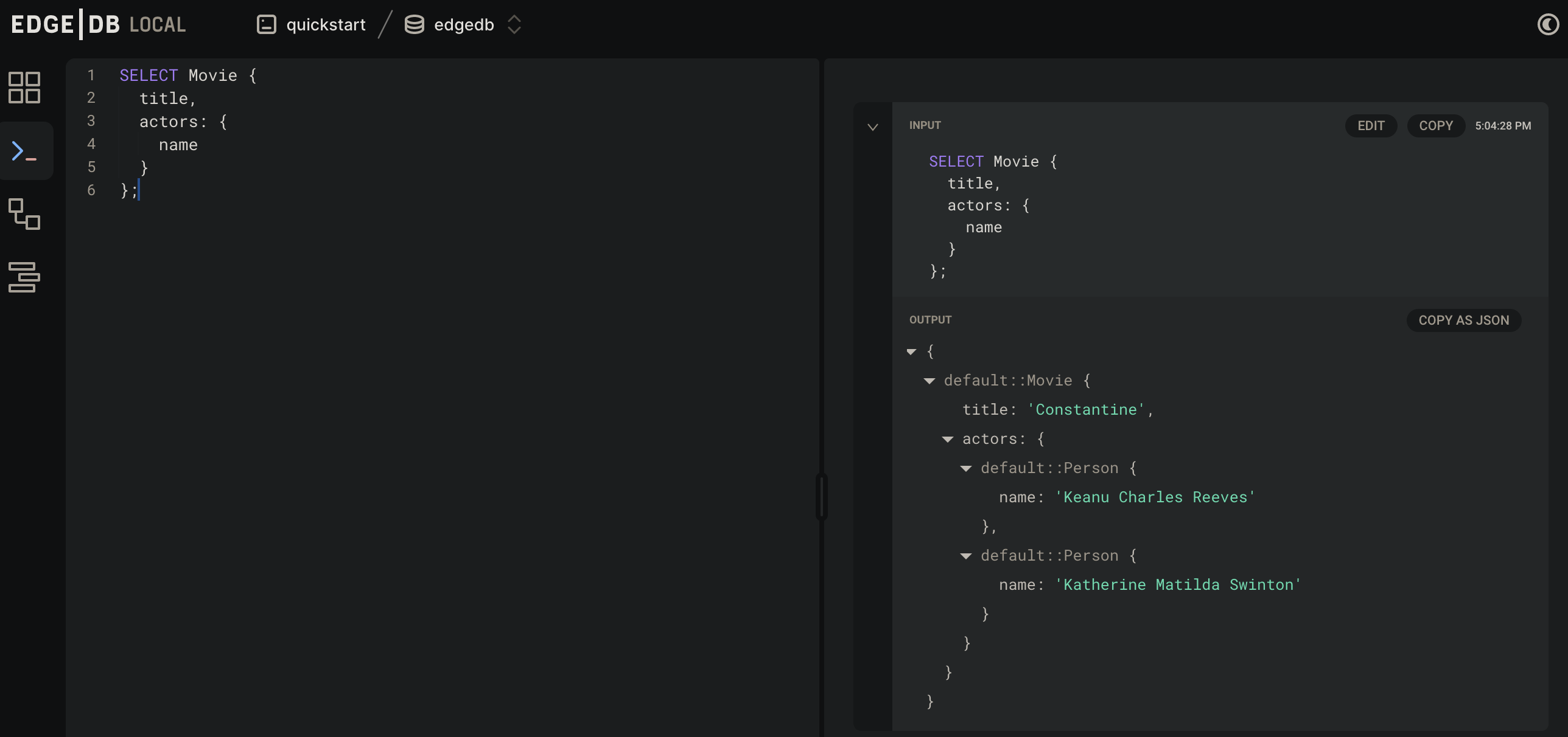 edgedb UI는 유용하지만 실제 프로그램에서는 쿼리 실행을 위해 edgedb client librarie를 사용하게 될 것입니다.