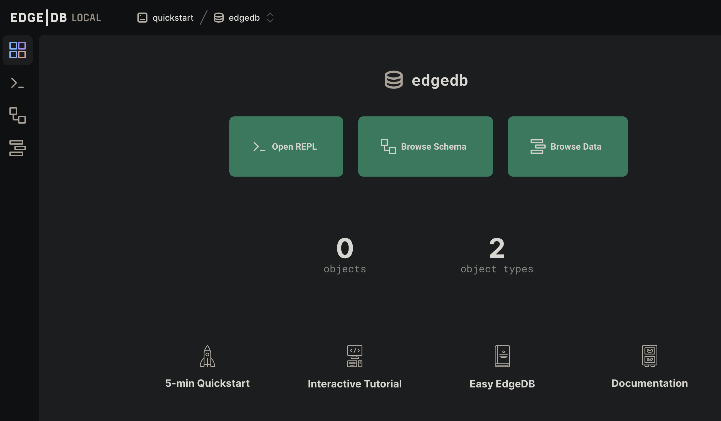 │ Schema dir (empty) │ /edgedb/quickstart/dbschema │